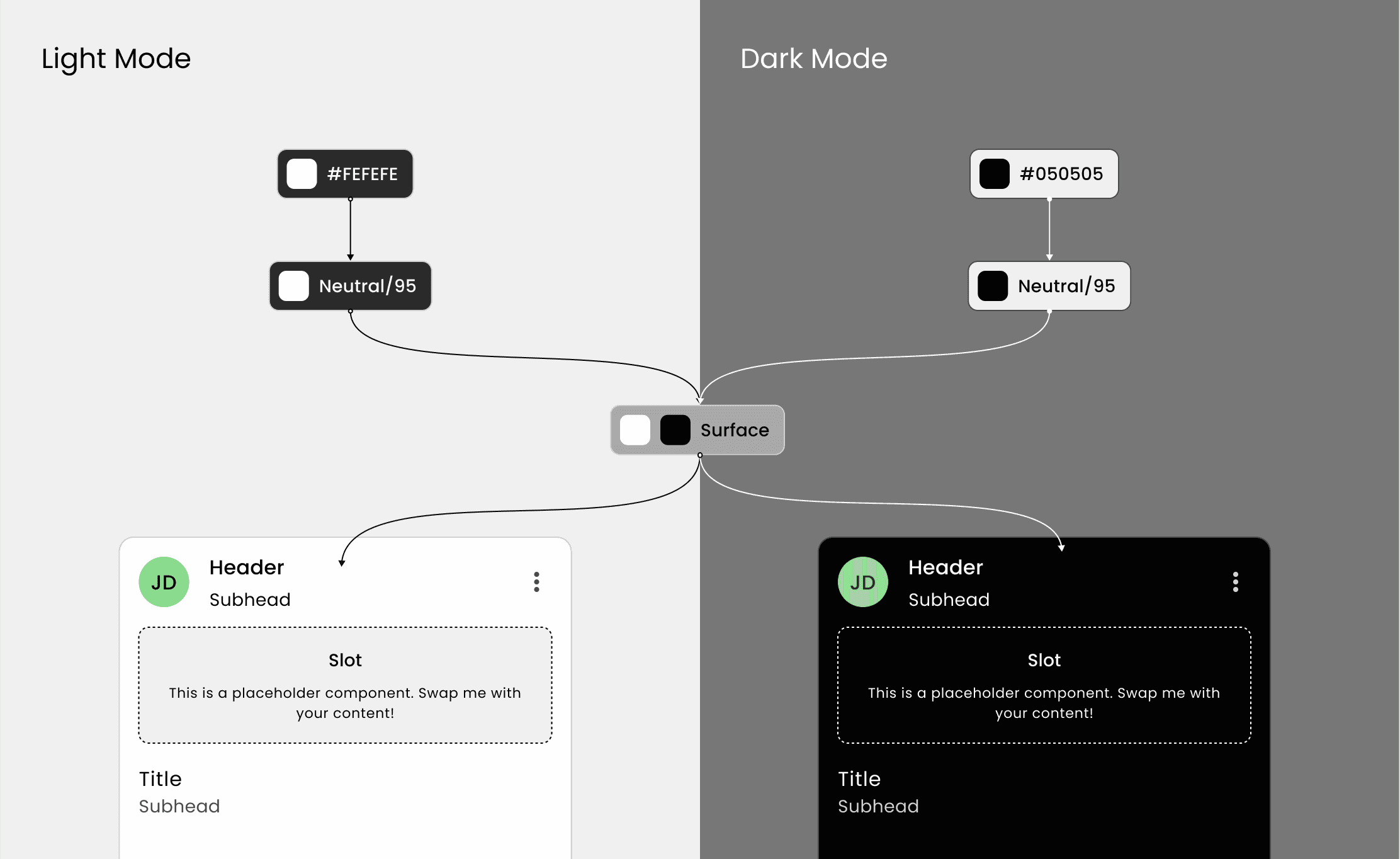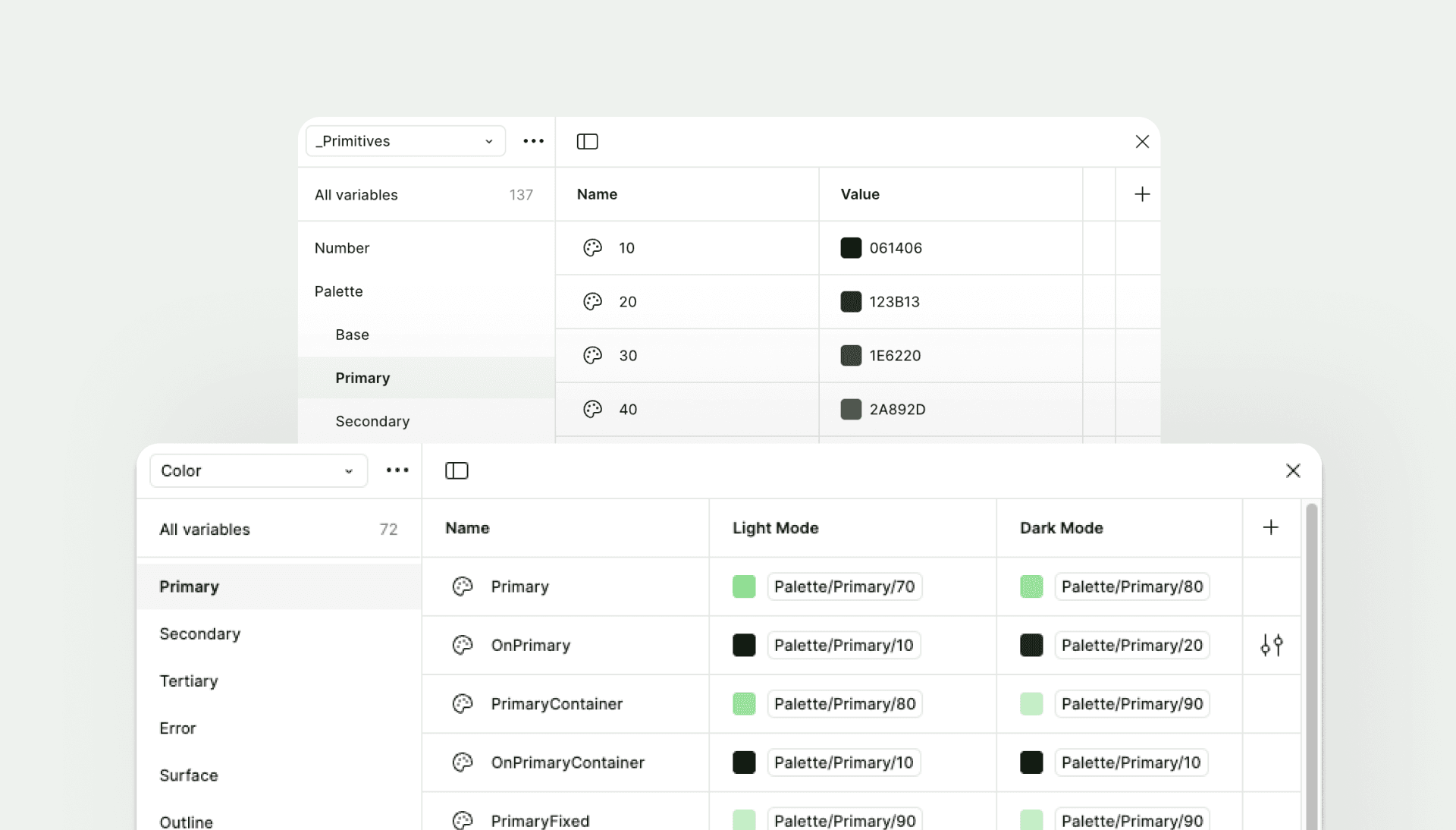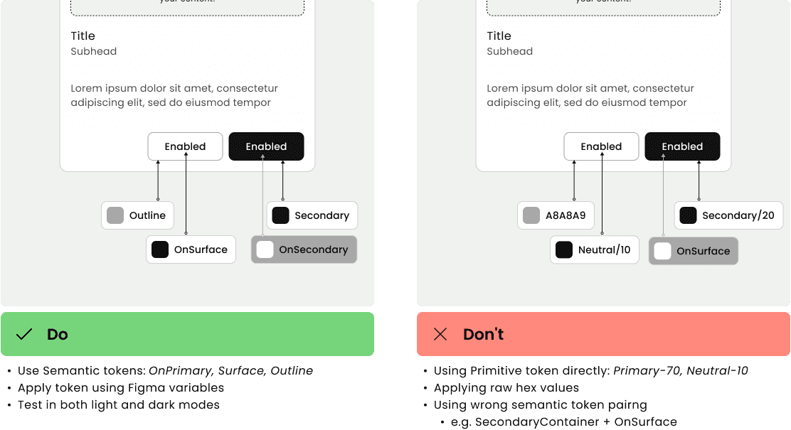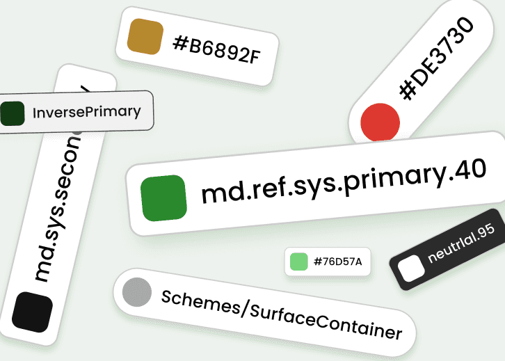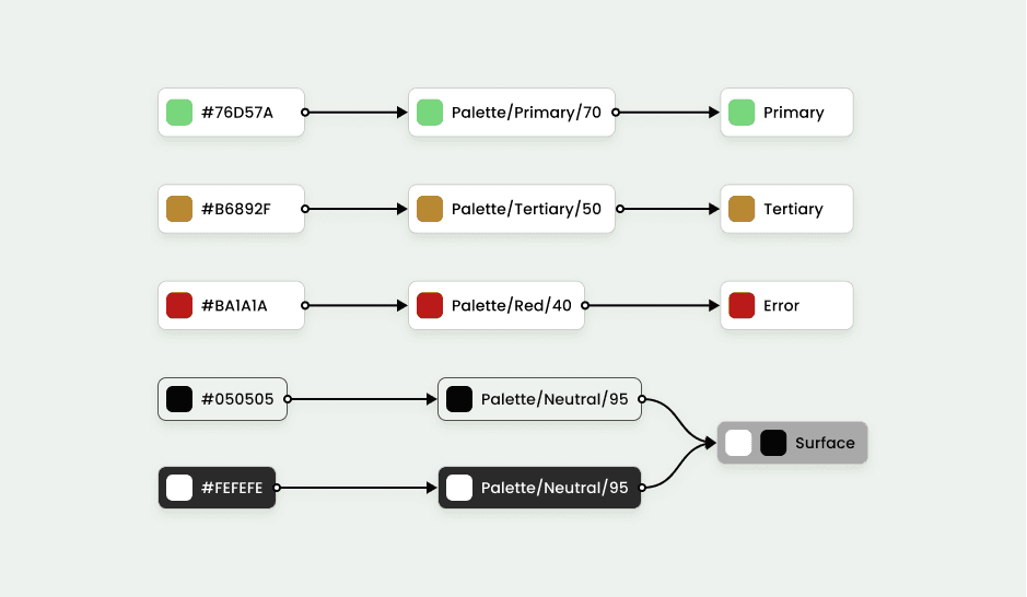 The goal here was to create a shared language between design and engineering teams, so I coordinated with developers to come up with appropriate taxonomy. After a discussion, we decided to modified our token name based on Material 3 Color Roles